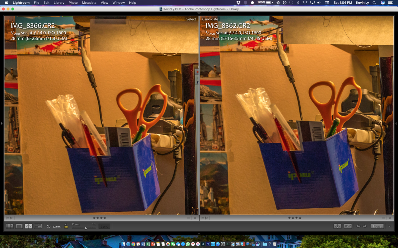The next set, I decided to test the 16-35 f/4 vs 28 at f/1.8 wide open. Most lenses are always a little soft wide open so I will then follow up with a f/2.2 test to mitigate the inherent softness wide open. The 16-35 will remain wide open at f/4 with IS on however.